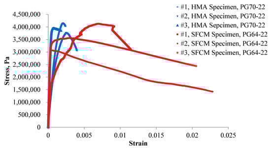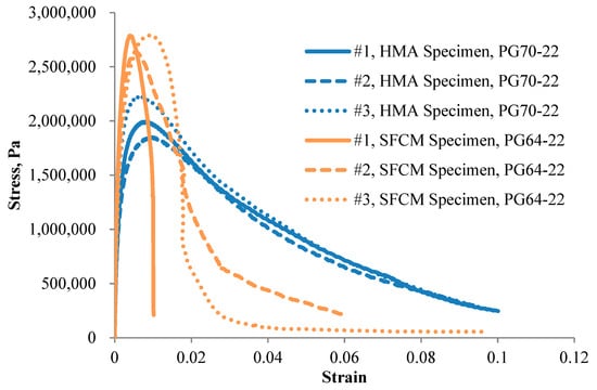 By determining the fracture behavior of SFCM at intermediate temperature, the IDT test can be used to evaluate the fatigue cracking resistance of SFCM which takes into account both the strength and the ductility of the mixture [15]. In this study, fatigue test was performed at a temperature of 20 °C and a strain rate of 50.8 mm/min. Three replicate specimens were tested and stress-strain relationship is shown in Figure 5 for both the SFCM specimens and the control HMA mixtures. The figure indicates that generally the SFCM specimens experienced higher maximum stress than the control HMA specimens, whereas the stress value of SFCM specimens decreases faster than that of HMA specimens after the peak value, showing a more brittle behavior. Table 2 compares the maximum stress and fracture work between the SFCM specimens and the HMA specimens. The maximum stress corresponds to the stress value at which failure strain occurs, and fracture work is calculated as the area under the stress-strain curve, which can be adopted to relate to the field fatigue performance of asphalt mixture. The results in the table plus that in Figure 5 indicate that the fatigue resistance of the SFCM specimens is not as strong as that of the control HMA specimens.