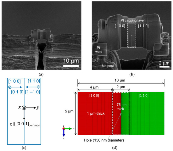 The stress-strain state of the electron-transparent part (indicated by a dashed box in Figure 1b) of the Ni lamella in the FIB specimen was simulated by FEM using ABAQUS/Standard 2018 [4]. Figure 1d shows the FE model used, which had similar dimensions to those of the Ni lamella with the same crystallographic orientations as the Ni lamella (Figure 1b,c). Dimensions of the electron-transparent region were set to 2 μm by 5 μm (width by height) for the FEA.