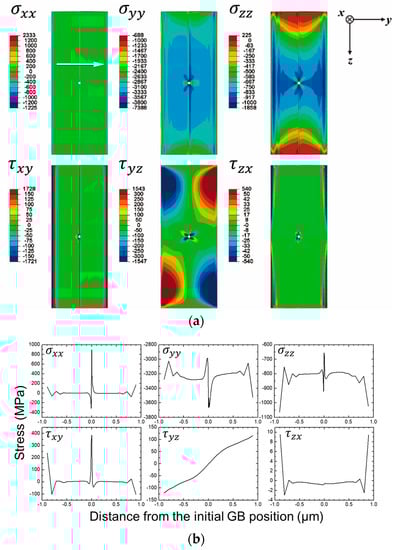 (a) Stress maps for the normal and shear components and (b) corresponding plots. The arrow in the map of indicates the data export points for the plots, which also applies to the plots in Figure 3. Reprinted from Ref. 4 with permission; Copyright Springer 2019.