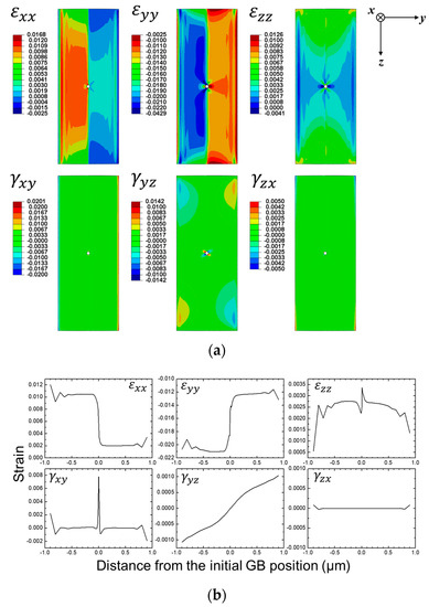 (a) Strain maps for the normal and shear components and (b) corresponding plots. Reprinted from Ref. 4 with permission; Copyright Springer 2019.