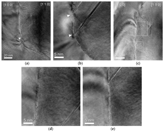 As shown in Figure 4, SFs with a length of 40–70 nm are observed near the GB. Such long SFs do not form inside the grains. Interestingly, one of two SFs shown in Figure 4b is not seen in a lower-magnification image, as indicated by an open triangle marking the original position of the missing SF in Figure 4a. Figure 4a was taken after Figure 4b. It is considered that the SF disappeared during the elapsed time between the two images. Figure 4c–e was taken from another region of the GB. Close examination of the region between the SFs (Figure 4d,e) reveals moiré patterns bulging from the [1 0 0] grain into the [1 1 0] grain, also demonstrating that the GB is prevented from migrating to the [1 1 0] grain at the tips of the SFs.