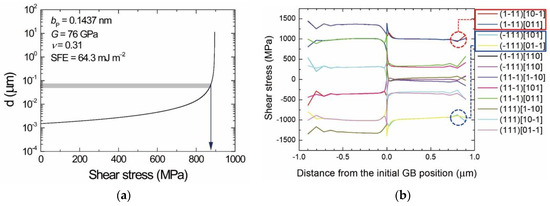 (a) Stress dependence of the separation distance for Ni. (b) FE calculation of shear stresses acting on slip systems. The inset shows materials parameters of Ni used for the calculation of the stress dependence = magnitude of the Burgers vector of partial dislocations (1/6 ), G = shear modulus, ν = Poisson’s ratio, and SFE = stacking fault energy). The components of the shear stresses appear in the legend of (b).