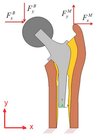 In this work, three different day-by-day loading cases are implemented: one-legged standing (L1), abduction (L2), and adduction (L3) [17]. Figure 2 shows the newly proposed model with boundary conditions of u2 = 0 at the lower cut in the cortical part, and with the following applied loads: The body (FB) and muscle forces (FM) in the x- and y-directions. The used components of different forces corresponding to the three loading cases: L1, L2, and L3 that are shown in Figure 2 are presented in Table 1.