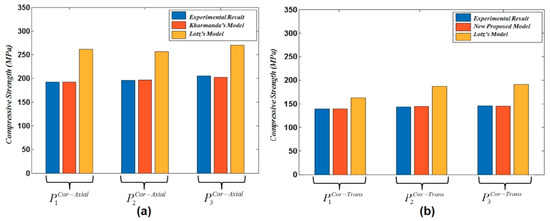 A comparison between experimental compressive stress in cortical bone for (a) Lotz’s model (Equation (12)) and Kharmanda’s model (Equation (16)) in the axial direction, and (b) Lotz’s model (Equation (13)) and the newly proposed model (Equation (17)) in the transversal direction.