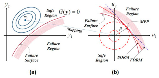 Equations (18) and (19) can be integrated into the constraints in Equation (20). According to Hasofer and Lind [24], operating in the standard normalized space of independent Gaussian variables (see Figure 5b) is much better to operating in the space of physical variables (see Figure 5a).