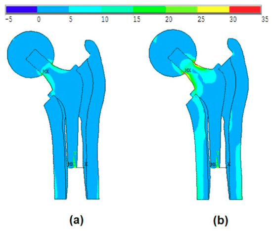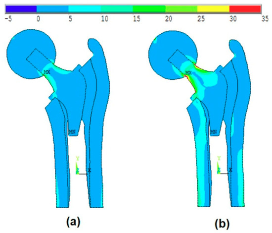 Figure 11a shows the effect of the introduction of the ball, bone anisotropy, and the stem shape optimization on the von-Mises stress distribution at the optimal point, while Figure 11b shows the von-Mises stress distribution at the failure point. The failure point is found on the failure scenario of the cancellous tissue in the transversal direction.