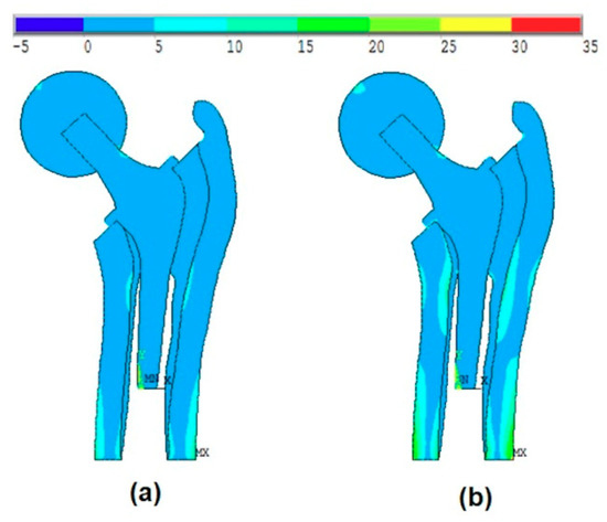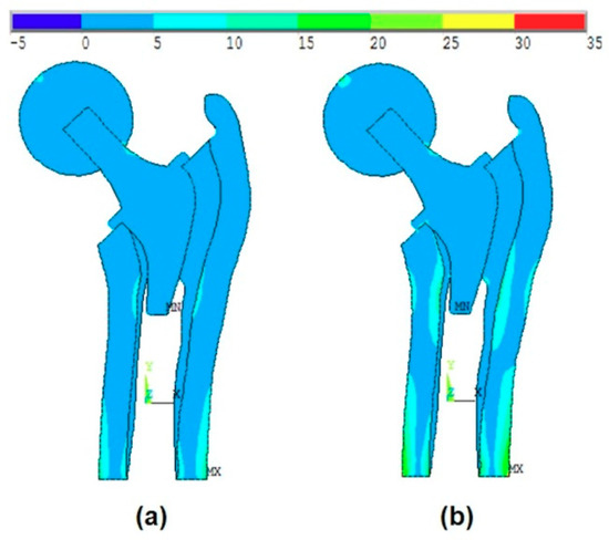 Figure 13a shows the effect of the introduction of the ball, bone anisotropy, and the stem shape optimization on the von-Mises stress distribution at the mean point, while Figure 13b shows the von-Mises stress distribution at the failure point. The failure point is found on the failure scenario of the cancellous tissue in the axial direction.