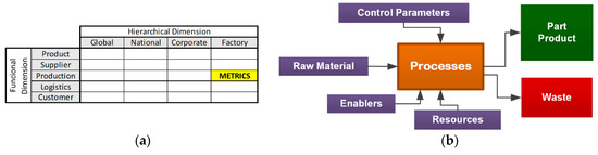 The hierarchical dimension of the activities (global, national, corporate, or factory), and the functional dimension (product, supplier, production, logistics, and customer) are shown in Figure 1a. This analysis allows us to select the production indicators at the factory level, at which in each industrial process there are proposals for the measurement of sustainability, among which manufacturing companies use the key performance indicators (KPIs) for the control and monitoring of their processes for continuous improvement.