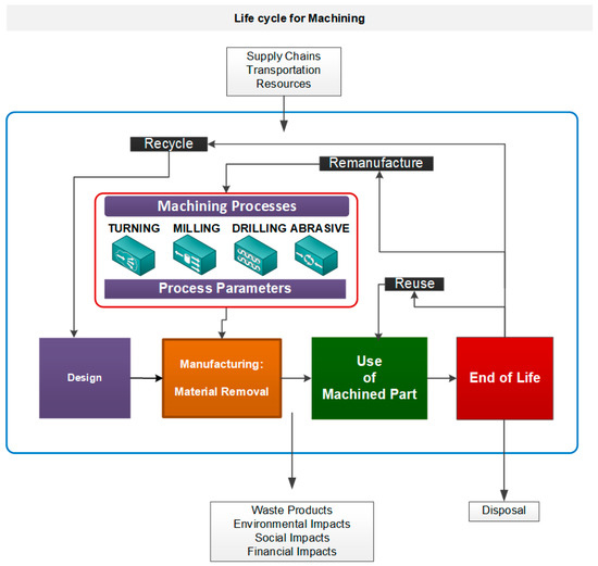 In materials and manufacturing engineering research topics, indicators are being proposed to measure the sustainability of industrial processes. Reich-Weiser et al. defined a general set of metrics for sustainable manufacturing [14], while Shuaib et al. [15] and Jayal et al. [16] designed a framework and a model for sustainable manufacturing, respectively. Singh et al. developed an expert system for the performance evaluation of small and medium enterprises [17]. With a greater focus on machining technologies, we find the work of Rajurkar et al., which explored how to ensure sustainability and optimize non-traditional machining processes [18].