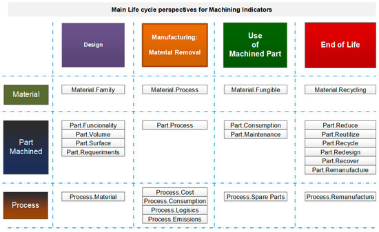 Vila et al. [29] proposed a framework for defining a structured set of metrics that are customizable for operations in different manufacturing technologies. Although the research work was applied to AISI 1018 material turning operations in order to analyze the surface integrity of the part, the contribution established the relationships between the machining parameters of the turning process and the final properties of the manufactured part, such as roughness, microhardness, and other parameters. This was the first attempt to link general sustainable metrics with technological-related metrics. For this reason, several perspectives were proposed. Table 1 shows Product, Process, and Resources (PPR) perspectives and some activity indicators that can be defined during the product life cycle. High-level general indicators aligned with sustainable objectives are initially created for each activity.