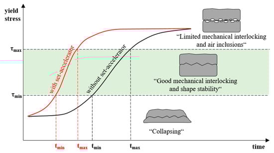 High manufacturing speed means the need for a rapid structural build-up of the deposited material, as the stability of the printed strand is based on the self-supporting function of the concrete due to the absence of a supporting formwork. In addition to the inherent stability of the strand, the printed material also has to bear the load of the subsequent layers. To enable the printed layer to bear the load of the next layer without collapsing, a minimum yield stress is necessary [5,17,18,19,20]. For this purpose, tmin defines the point in time when a subsequent layer can be applied to the existing layer [20], see Figure 1. Achieving the minimum required yield stress is highly dependent on the mixtures composition and the used admixtures. In particular, the use of set accelerators significantly changes the setting behaviour of the concrete and enables, derived from this, the manufacturing of large building heights.