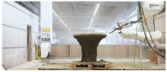 For large-scale additive manufacturing in construction, mainly extrusion or shotcrete 3D printing techniques, where the premixed cementitious material is extruded or sprayed in long strands, are applied. In general, two main strategies can be distinguished: (I) the deposition of narrow strands of several centimetres’ width, which are either stitched to create the desired structure or used to build a filigree formwork structure strengthened by an inner structure (compare concrete printing [4,5,6,7,8,9,10] and contour crafting [11,12,13,14]) and (II) the deposition of broad strands of several decimetres’ width, which are used to build the whole width of the component in a single pass as a kind of ‘infinite brick’ (compare, e.g., ConPrint3D [15,16]). The major advantage of these techniques is the high manufacturing speed for creating large-sized monolithic structures as well as the building size of the produced elements.