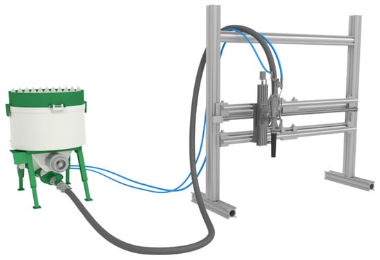 For material processing, a small lab-scale SC3DP unit is used (Smart Additive Manufacturing Material Investigator—SAMMI, manufactured inhouse). SAMMI contains an x–z-linear axis with maximum gantry speed of up to 5 m/min, Figure 4. The shotcrete material is produced outside of the working space with a pug mill mixer and pumped (Mader WM Variojet FU, Erbach, Germany) through a hose to a shotcrete nozzle. Inside the nozzle, the concrete is torn up by air twice—firstly with pressurized air only and secondly with pressurized air and-if applicable - accelerator, compare also [50].