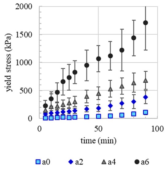 Yield stress evolution over time after deposition of sprayed strands containing 0% (a0), 2% (a2), 4% (a4) and 6% (a6) of the accelerator.