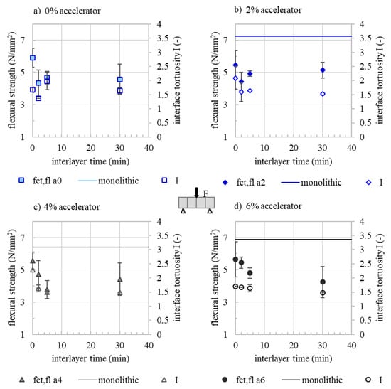 28 d flexural strength fct of monolithic specimen and specimen with various interlayer times as well as according interface tortuosity I of (a) a 0%, (b) a 2%, (c) a 4% and (d) a 6% (for each accelerator dosage, a minimum of six drilling cores and seven prisms is evaluated) depending on the interlayer time.