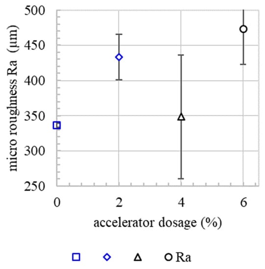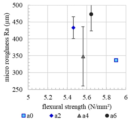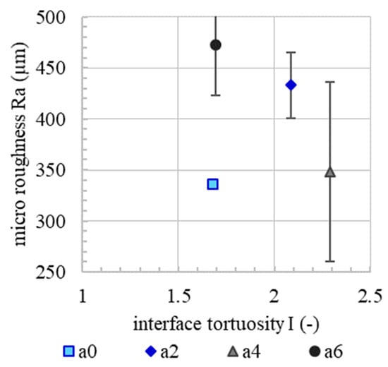 Since micro roughness tends to increase with increasing accelerator dosage, Figure 10. Since the basic mixture, e.g., the granulometric characteristic, is the same for all experiments, it is presumed that the micro roughness correlates with the yield stress of the material. In the spraying process, the material volume receives the same kinetic energy. However, material with a higher content of accelerator needs a higher energy to reach the same level of compaction as a material with a lower content of accelerator. This leads to a rougher surface. However, there is no correlation between the micro roughness and flexural strength or the interface tortuosity, Figure 11 and Figure 12. This means that, in the SC3DP process, the mechanical bond between two layers is induced less by the micro roughness generated on the free surface during the production of the bottom layer than by the tortuosity generated by the imprinting of particles during the application of the subsequent layer. Here, micro roughness plays a minor role regarding interlayer strength compared to interface tortuosity, which depicts the macro roughness of the interlayer and corresponds with a vertical interlocking-amplitude of up to 4.3 mm. The interlocking effect of interface tortuosity is several magnitudes higher than micro roughness. The characteristic of the interlocking is depending on the yield stress of the lower layer (deformability, which is time-dependent) and has therefore a superior effect on the flexural strength for SC3DP specimen, Figure 13.