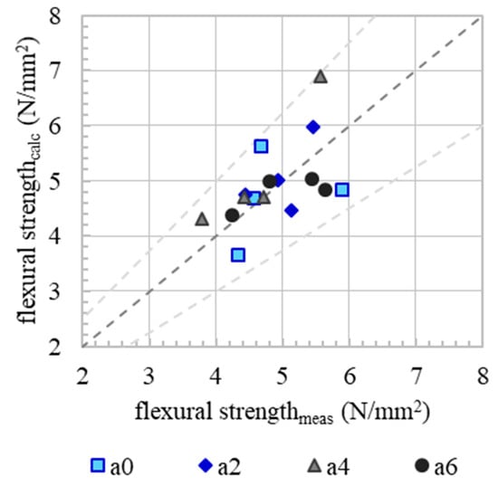 Correlation (dark grey dashed line) of measured and calculated flexural strength. Calculations are based on a modification of Walraven’s model for stress transmission in cracks. Bright grey dashed line indicates the range of certitude (0.75× and 1.25×).