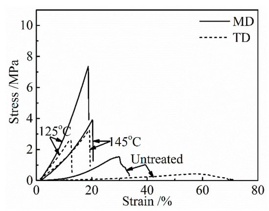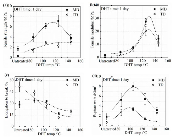 9]. With an increasing DHT temperature, strength and modulus increased and elongation to break decreased, and after showing the maxima in strength and modulus, they tended to decrease after the application of the DHT treatment at higher temperatures.
