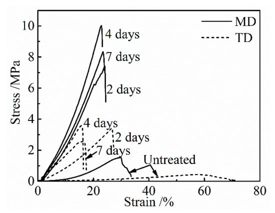 Figure 1. The untreated collagen film shows a poor mechanical property, and a significant directional anisotropy was observed. Tensile strength and modulus are much higher, and the elongation to break is lower in MD, indicating a preferred molecular orientation in MD. The preferred orientation of collagen fibrils to MD in the collagen film, which was artificially prepared, has been confirmed by using SAXS [