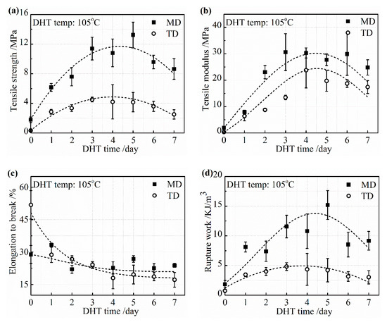 Figure 4a–d. The tensile strength and tensile modulus increased rapidly with an increasing DHT time in both MD and TD in 3 days. Then, the increasing speed showed the plateau phase. The tensile strength began to reduce when the DHT time was longer than 5 days. A similar change tendency in the tensile modulus was obtained. The elongation to break monotonically decreased with an increasing DHT time and reached a constant value. The reduction of the elongation to break by the application of DHT may be due to not only the elimination of water, which acts as the plasticizer, but also because of the crosslinking between collagen molecules, which restricts the intermolecular mobility. The variation of tensile strength, tensile modulus, and elongation to break, with an increasing DHT time, resulted in the rupture work going up first and down with DHT time.