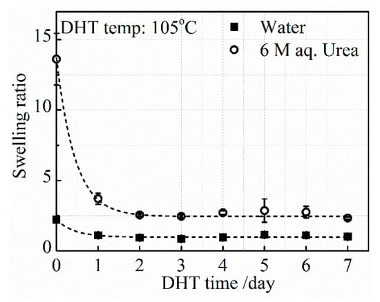SRwater continued until 3 days of DHT treatment, and these stayed constant at a longer DHT time. The density of covalent crosslinking increased with DHT time at 105 °C in 3 days. However, a further application of DHT treatment did not change the ratio between hydrogen-bonded and covalent crosslinking densities at 105 °C.