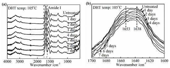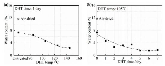 Figure 7a. About 2 wt% of water still remained, even after DHT treatment applied at 145 °C. Under the different periods of DHT time at 105 °C, about 5 wt% of water remained after 1 day. It reduced gradually to about 2 wt% for a longer DHT time in