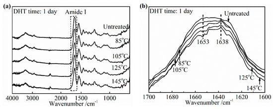 −1, comparing with the spectra of the untreated collagen film. Moreover, the extent of reduction increased with an increasing DHT temperature. In contrast, the absorption at 1638 cm