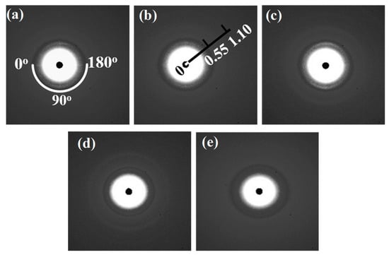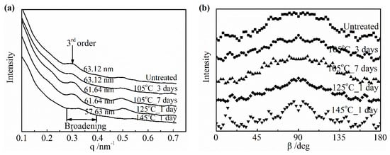 Figure 11. All of the patterns show a stronger diffraction at the meridional direction, due to a shear flow applied at the preparation of the film. For visualized and precise structural analyses, meridional and azimuthal plots of SAXS spectra were conducted in