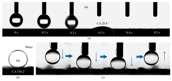 (a) Dynamic contact angles of a water droplet on microfiber filter in air; (b) Contact angle of 1,2-dichloroethane on microfiber filter in water; (c) Photographs of a 1,2-dichloroethane droplet contacting with and leaving from the microfiber filter.