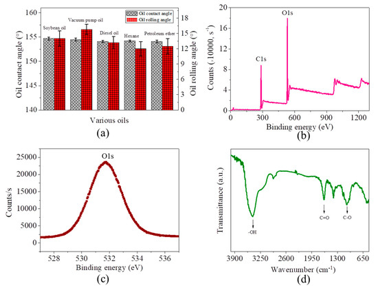 (a) Contact angles and rolling angles of five kinds of oils on the microfiber filter in water; (b) Oxygen content analysis of the microfiber filters by XPS; (c) Symmetric O1s peak centered at 531.6 eV; (d) Identification of chemical groups on the microfiber filters by FTIR.
