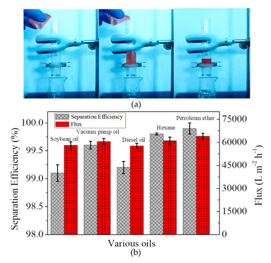 The separation of free oil/water mixtures by the microfiber filter was firstly evaluated, with gravity as a driving force. As shown in Figure 4a, after pouring a mixture of hexane (dyed by Sudan III) and water into the device, the hexane is rejected on microfiber filter while water penetrate it, achieving the separation of hexane and water. The separation efficiencies for oils tested in this work are all higher than 99%, accompanied by a flux of as high as approximately 60,000 L m−2 h−1 at an altitude difference of 8 cm (Figure 4b). The high separation efficiency and high flux enable the microfiber filters to be high-performance material for water/oil separation.