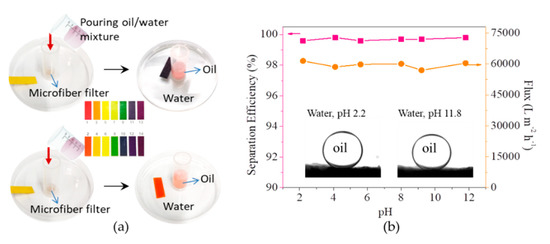 (a) Filtration of strong acid/base-based water/oil mixtures; (b) Separation efficiencies and fluxes of microfiber filters as a function of pH of water/oil mixtures (Inset shows the oil (1,2-dichloroethane) contact angles on microfiber filters in water at pH 2.2 and pH 11.8).