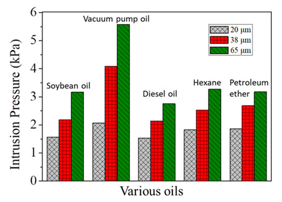 Apart from separation efficiency and flux, the intrusion pressures of microfiber filters for various oils are also investigated, since it is a very important parameter influencing separation performance. As shown in Figure 6, the intrusion pressures for oils tested are all higher than 1.5 kPa, which suggests the microfiber filters can be applicable in practical separation processes. It is also found that, the intrusion pressure increases with an increase in thickness of microfiber filters for all oils. For example, if the thickness increases from 20 to 65 μm, the intrusion pressure for vacuum pump oil correspondingly increases from 2.1 to 5.6 kPa. This is because, with the increase of thickness, the apparent pore size of the microfiber filter contrarily decreases.