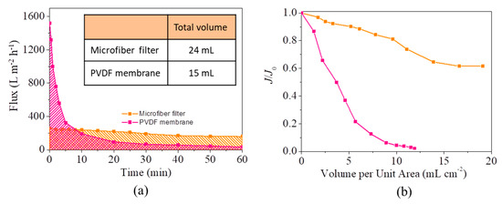 (a) Fluxes of microfiber filter and PVDF membrane decline with time (Effective area: 3.2 cm2; Pressure difference: 0.4 bar). Inset shows the total volume of emulsion treated by microfiber filter and PVDF membrane in one hour; (b) Flux retention rate (J/J0) as a function of filtrate volume per unit area (mL cm−2).