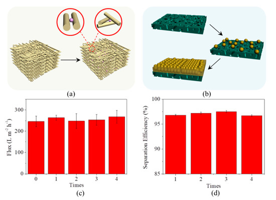 (a) Scheme for the illustration of the location of oil drops after being rejected by microfiber filter; (b) Scheme for the illustration of the location of oil drops after being rejected by PVDF membrane; (c) Fluxes of microfiber filter as a function of clean times; (d) Separation efficiencies of microfiber filter as a function of clean times.