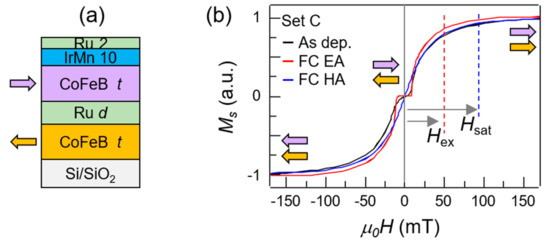 - Wiese, N.; Dimopoulos, T.; Rührig, M.; Wecker, J.; Reiss, G.; Sort, J.; Nogués, J. Strong temperature dependence of antiferromagnetic coupling in CoFeB/Ru/CoFeB. Europhys. Lett. 2007, 78, 67002. [Google Scholar] [CrossRef][Green Version]