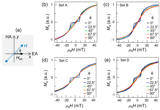 Figure 2 shows the room temperature hysteresis loops after field cooling as a function of the angle of the external field applied in the plane of the sample. Panel (a) shows the geometry of the measurement. In particular, ϕ is the angle between the direction of the exchange bias Heb, set during the field cooling, and the direction of the external field applied during the measurement H. Specifically, the easy magnetization axis (EA) is given by ϕ = 0° and the hard axis (HA) is for ϕ = 90°. The measurements were performed in the same conditions on all the sets with a step of 22.5° from ϕ = 0° to ϕ = 90°, color-coded. In all the sets, the loops feature the characteristic two lobes and low-field plateau along the EA, and the elongated loop along the HA. For intermediate angles, the loops assume a mixed EA and HA character, with the low field plateau progressively tilting to higher derivatives. Some samples show at low field a small hysteresis loop, probably due to slightly non-compensated ferromagnetic structures. The origin of non-compensation can be ascribed to the small variation of the CoFeB deposition conditions, or possibly to the influence of the surface roughness of one of the two ferromagnetic layers [33,34].