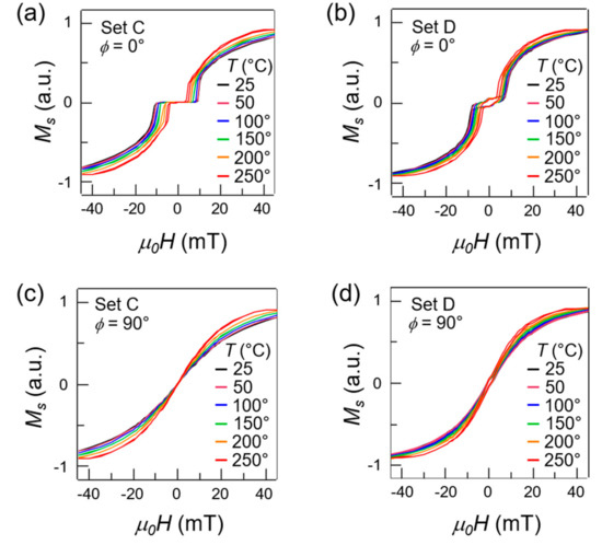 (a,b) Hysteresis loops of set C and set D along the easy-axis (ϕ = 0°) measured as a function of temperature (color-coded) ranging from 25 °C to 250 °C; (c,d) Hysteresis loops of set C and set D along the hard-axis (ϕ = 90°) measured as a function of temperature (color-coded) ranging from 25 °C to 250 °C.