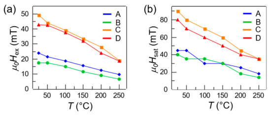 For analyzing quantitatively the characteristics of the hysteresis loops, in Figure 4 we plotted the exchange field Hex (a) and saturation field Hsat (b) as a function of the temperature for all the sample sets (A–D). From the room temperature data (at T = 25 °C) of both panel (a) and panel (b), we observed higher Hex around 45 mT and Hsat around 85 mT in sets C–D, and lower Hex around 20 mT and Hsat around 40 mT in sets A–B. This was consistent with the oscillatory nature of the interlayer coupling as a function of the Ru thickness, which was 0.6 nm in sets C–D and 0.7 nm in sets A–B. It is worth noting that, the Ru thickness being equal, slightly higher exchange and saturation fields were observed in the sets characterized by thinner CoFeB layers (set A, 25 nm and set C, 35 nm). This is coherent with the interfacial nature of the antiferromagnetic interlayer coupling, which is inversely proportional to the film thickness.