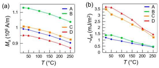 In Figure 5, we studied the saturation magnetization (a) and the interlayer coupling strength (b) as a function of temperature. Ms measured at room temperature is 0.9–1.1 × 106 A/m in all sets, which is in agreement with values found in the literature [38,39] for CoFeB films with the same stoichiometry. The Ms, which lowers with increasing temperature due to magnon excitation [40], was calculated normalizing the quantitative VSM measurements by the magnetic volume of each sample. The slight variations observed across different samples are due to non-idealities in the sample shape. In order to study the dependence of the coupling coefficient on the temperature, we calculated the total effective coupling strength Jeff = HexMst, where Hex is the exchange field (see Figure 1b), Ms is the saturation magnetization and t is the sample thickness. The physical origin of such dependence can be ascribed to both interfacial effects, spacer-related mechanisms or effects arising in the magnetic layers [41]. In panel (b) we plot Jeff as a function of temperature for all the sets. As previously noted, sets A and B (Ru 0.7 nm thick) feature a lower Jeff~ 1.25 mJ/m2 with respect to sets C and D (Ru 0.6 nm thick), which feature Jeff~ 3.5 mJ/m2 at room temperature, due to the different Ru interlayer thickness, consistently with the expected oscillatory behavior [2]. Noteworthy, Jeff was reduced reversibly by 60–65% from room temperature to 250 °C with only slight variations across different sets, suggesting that even mild heating treatment could significantly and temporarily alter the SAF coupling strength, with high potential for applications. These results were consistent with those found in similar system, namely synthetic antiferromagnets based on thin ferromagnetic layers with in plane and perpendicular to the plane magnetic anisotropies [35,42]. The theoretical explanation of the decrease of interlayer exchange coupling with the temperature can be found in [41].