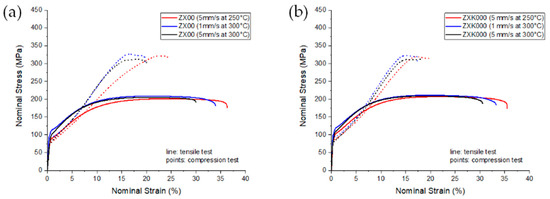Stress–strain diagrams from tension (solid lines) and compression (dotted lines) tests at ambient temperature: (a) ZX00; (b) ZXK000.