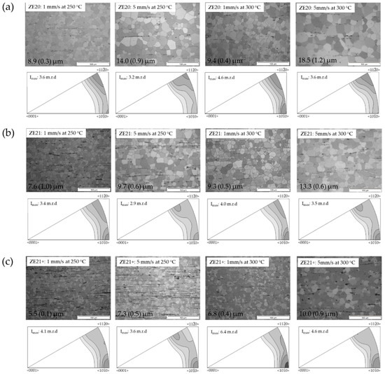 Micrographs from longitudinal sections and inverse pole figures in the extrusion direction of extruded Mg-Zn-Ce alloy (ZE-series alloys) at varied temperatures and extrusion speeds; numbers indicate average grain sizes: (a) ZE20; (b) ZE21; (c) ZE21+.
