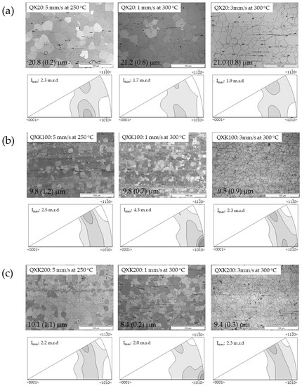 Micrographs from longitudinal sections and inverse pole figures in the extrusion direction of extruded Mg-Ag-Ca alloy (QX-series alloys) at varied temperatures and extrusion speeds; numbers indicate average grain sizes: (a) QX20; (b) QXK100; (c) QXK200.