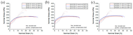 Stress–strain diagrams from tension and compression tests at ambient temperature: (a) QX20; (b) QXK100; (c) QXK200.