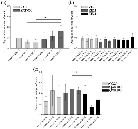 Degradation rates (mm/year) of the different alloy series: (a) ZX, (b) ZE, and (c) QX. Bars represent the arithmetical mean ± standard deviation (SD). Stars indicate statistically significant difference between treatments (* p ≤ 0.05).