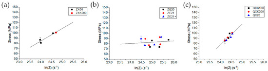 Steady state extrusion stress vs. a temperature compensated strain rate Z for the three alloy series; lines from linear regression are to guide the eyes: (a) ZX-series alloys, (b) ZE-series alloys, and (c) QX-series alloys.