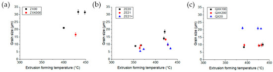 Average grain size correlation to the extrusion forming temperature (measured in the die): (a) ZX-series alloys, (b) ZE-series alloys, and (c) QX-series alloys.