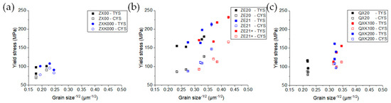 Yield stresses in tension and compression vs. the inverse square root of the grain size (Hall–Petch plot): (a) ZX-series alloys, (b) ZE-series alloys, and (c) QX-series alloys.