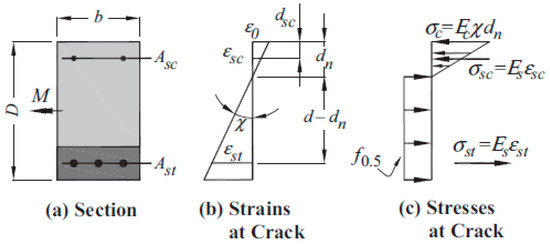The compressed zone height x in Amin, Foster, and Kaufmann’s method can be determined by considering the force equilibrium of the cracked section and strain compatibility (Figure 2). Unlike the determination of x for plain RC members, an iterative procedure is required for SFRC as the assumed stress carried by the fibers f0.5 is independent of the induced strain. Amin, Foster, and Kaufmann did not describe what f0.5 precisely was. Most likely, it was the residual tensile strength calculated at a CMOD = 0.5 mm.