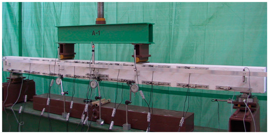 The rig for short term testing of beam elements was composed of a steel frame, hydraulic cylinder (fitted with the possibility to slide towards the top frame belt), and load control system. The static diagram of the tested elements was a single span freely supported beam loaded with two concentrated forces applied at 1/3 span between the support axes (Figure 3). The forces were applied via steel beam loaded with the hydraulic cylinder of 246 kN in range. On the bottom beam of the frame, two supports were mounted. Roller and pinned supports were designed in such way so that reaction measurement with tensometric force gauges could be performed (range, 100 kN). The load applied was controlled by reading support reaction force with the application of the SAD 256 computer data acquisition system (APIG Sp. z o.o., Łódź, Poland).